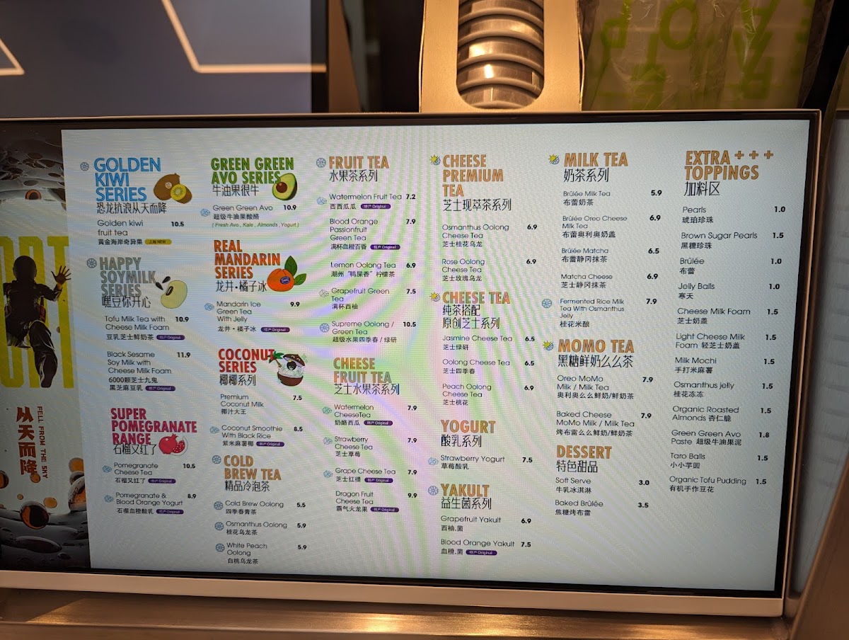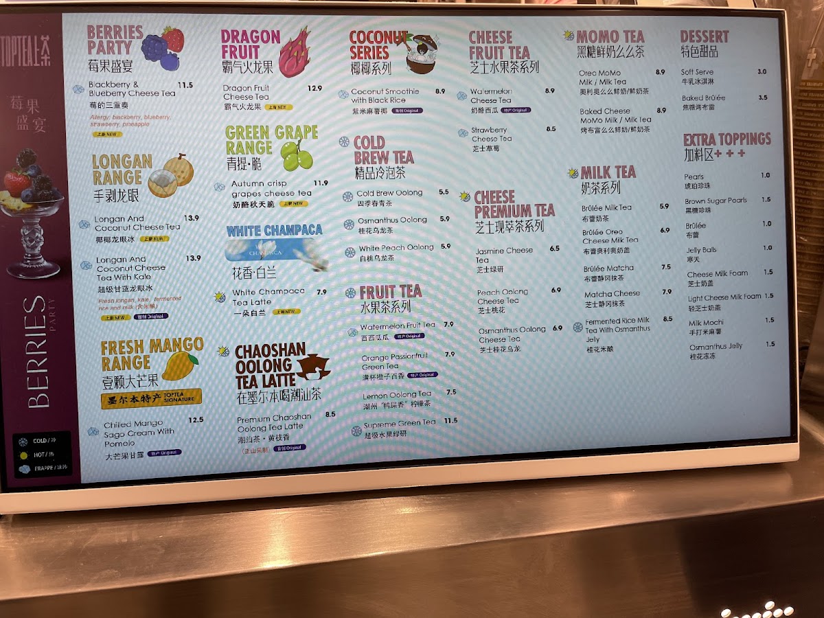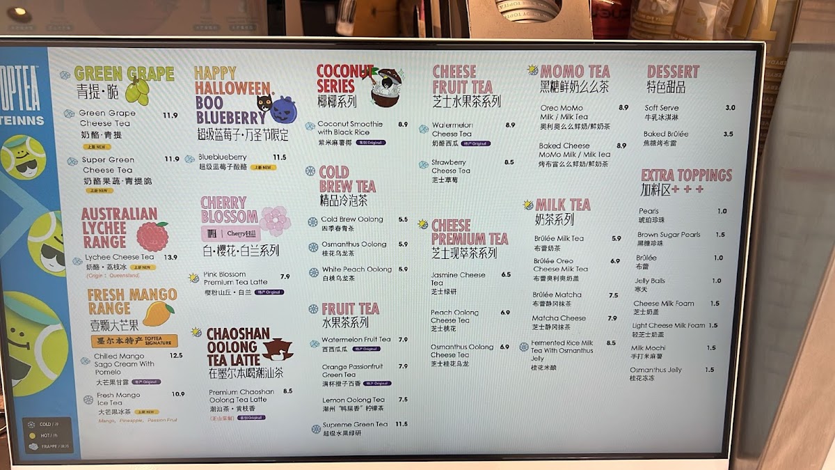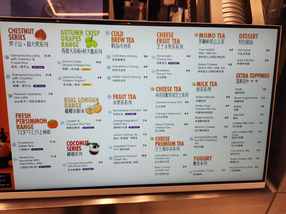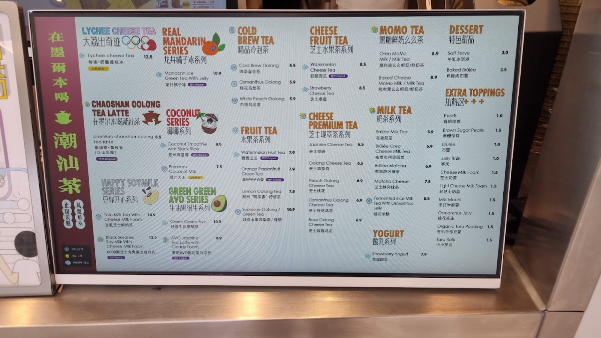 Top Tea - Clayton offers a diverse and delightful menu, with options ranging from refreshing fruit teas to rich milk-based beverages and indulgent desserts. The Coconut Smoothie With Black Rice (紫米麻薯椰) stands out as a unique treat for $15.00, while the Hojicha & Coconut Frappé and Hojicha & Coconut Tea Latte offer a fragrant, nutty twist for those looking for a more comforting option. Fruit tea lovers will enjoy the Watermelon Fruit Tea (西西瓜瓜) and Orange Passionfruit Green Tea (满杯橙子百香), each offering vibrant flavors at reasonable prices. The Brulee Milk Tea (布蕾奶茶) and Brulee Oreo Cheese Milk Tea (布蕾奥利奥奶盖) are indulgent favorites, with the latter combining the richness of brulee with a satisfying Oreo cheese topping. For a more premium experience, the Cheese Premium Tea Series features options like Jasmine Cheese Tea (芝士绿妍) and Osmanthus Oolong Cheese Tea (芝士桂花乌龙), delivering a creamy, floral touch. The Baked Brulee (焦糖烤布蕾) is an irresistible dessert to end the meal, offering a sweet, caramelized delight. Additionally, the Oreo Cheese MOMO Fresh Milk and Baked Cheese MOMO Fresh Milk are perfect for those looking to combine the comforting taste of fresh milk with indulgent toppings. With a wide range of options for all tastes and a casual atmosphere, Top Tea - Clayton provides a perfect destination for those craving a tasty drink or dessert.